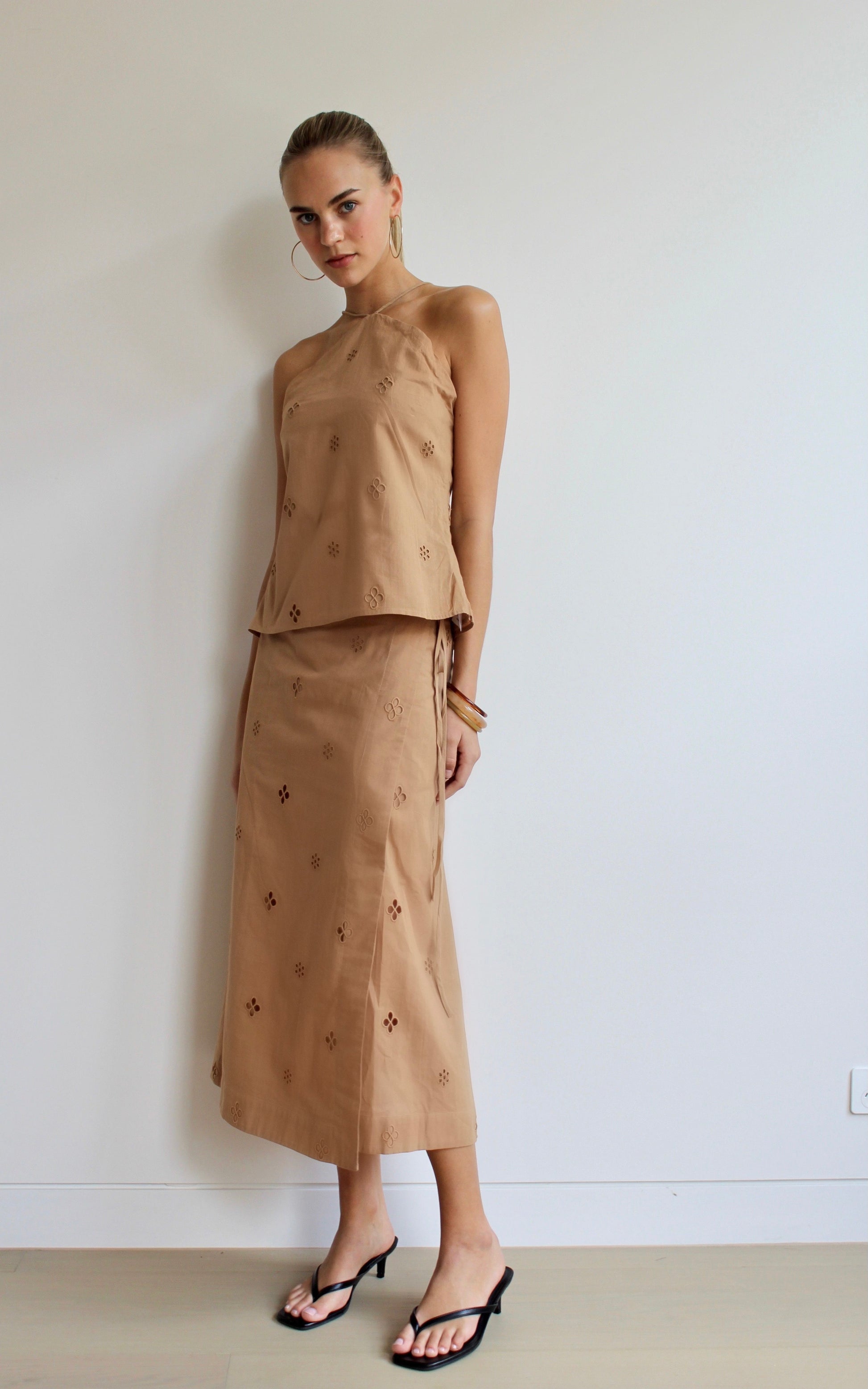 The little top with a lot of charm. The Cleo Top features a flattering halter neckline and soft cotton broderie with delicate embroidery throughout. Light, breathable, and cut to flatter, it ties at the back and has a smocked back to make it fit to your body shape. Perfect when paired with our Cleo mini or maxi skirt, or worn with your favourite denim for a more undone vibe. It's the kind of top that makes getting dressed feel effortless.